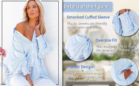Smocked Cuff Boyfriend Shirt: Casual Striped Shirts for Women with Pocket, Stylish V Neck, Striped Print, Smocked Long Sleeve Shirred Shirt, Summer Tunic Tops for women. Casual and creative design make you look stylish and charming.