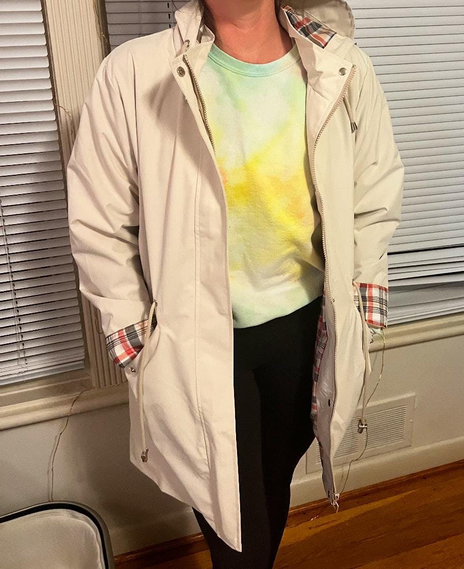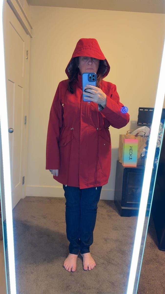 Really really nice rain jacket. Love that you can take off the hoodie. Like that the hoodie has extra room to protect the face. Good quality material. Fascinated with the color